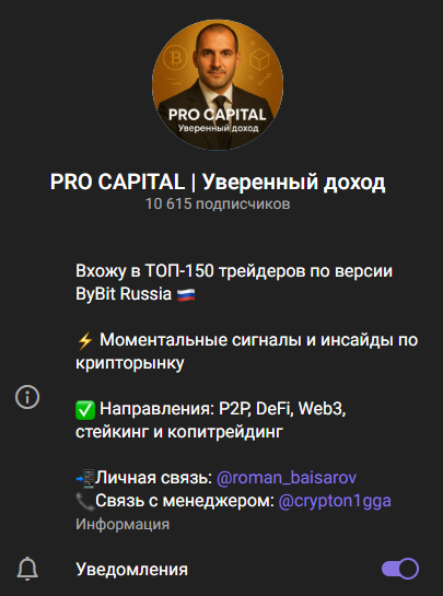 В шапке профиля «Про Капитал | Уверенный доход» заявлено, что Роман входит в ТОП-150 трейдеров по версии ByBit Russia, но реальных доказательств этому факту нет. Инвестор не предлагает подписчикам и официальную лицензию или верифицированную статистику сделок. На канале Roman Baisarov обещает моментальные сигналы и инсайды по крипторынку. Направления его профессиональной деятельности: