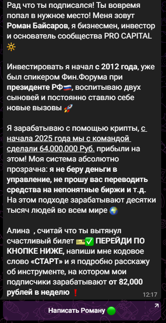 Также при отправке заявки активируется бот. В приветственном сообщении некоторая информация о профессиональному пути автора. Роман начал инвестировать в 2012 году, а непосредственно зарабатывать с начала 2025 года. Как утверждается, вся его команда вышла на прибыль в ₽64,000,000. При совместном трейдинге Роман Байсаров не предлагает отдать ему деньги в управление или регистрироваться на конкретных биржах. Только и конкретики в системе Романа также нет. Чтобы узнать подробности платных услуг, необходимо обратиться в личные сообщения. На старте трейдер обещает доход от ₽82,000 в неделю.