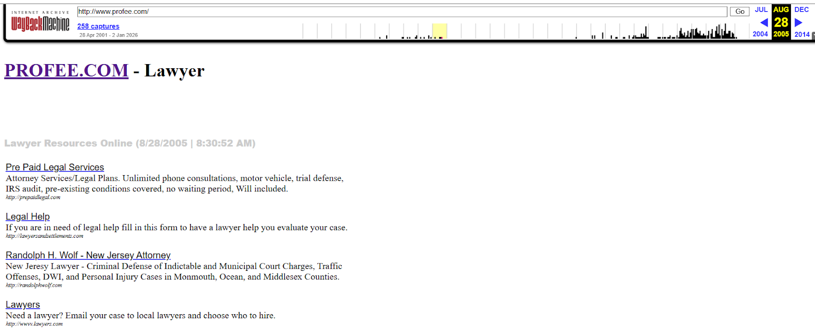 Проверка домена показала, что его зарегистрировали еще 29.03.2002, хотя на главной странице ресурса написано про начало работы с 2017 года.Для более детального анализа мы зашли в веб-архив, и оказалось, что до 2017 года у «Профее» практически нет снимков, а в самом начале адрес использовали для ссылок на услуги юристов.