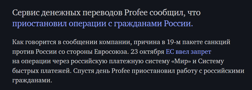 Также в сети иногда встречаются отзывы о платежной системе Profee com от пользователей в России, которые раньше делали переводы постоянно, но с октября 2025 года такая возможность для них стала закрыта, поэтому они жалеют о введении ограничений.