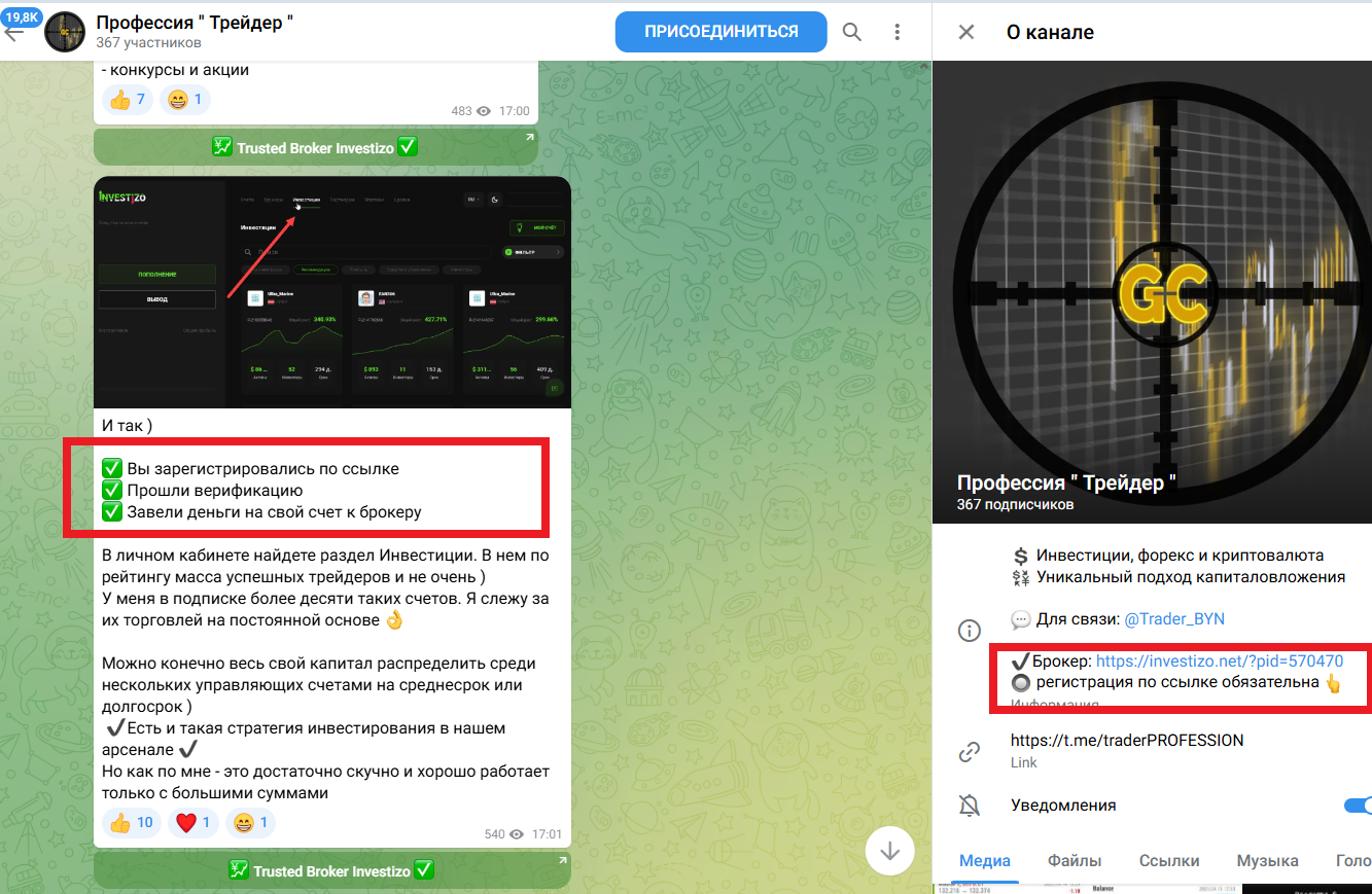 Админ Trader byn просит проходить регистрацию по его промокоду, а после чего копировать сделки. В реальности автор может получать доход на убытках партнеров. Рекламы сторонних пабликов в блоге не было.