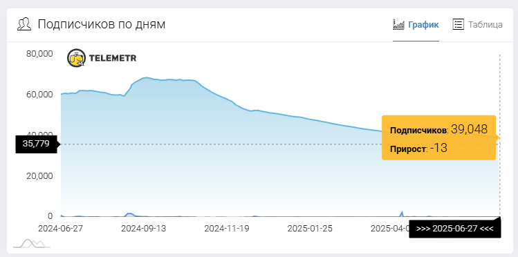 Цифры канала шокируют. Сейчас 39 048 подписчиков, но посты смотрят всего 800–1000 человек. Это меньше 4% от всей аудитории. Раньше в канале было 68 тысяч участников – проект потерял почти половину людей.