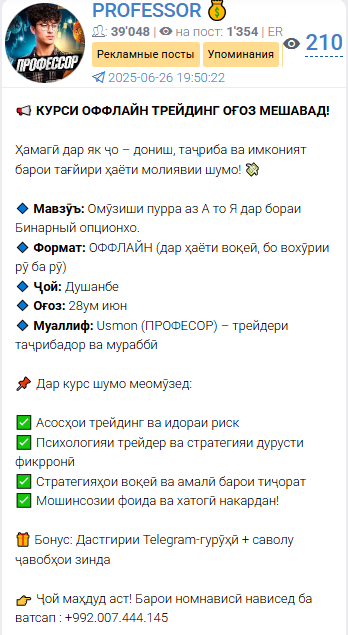 Усмон проводит живые курсы в Душанбе. Записаться можно через WhatsApp. Стоимость он не называет. Странно для «известного» трейдера скрывать базовую информацию.