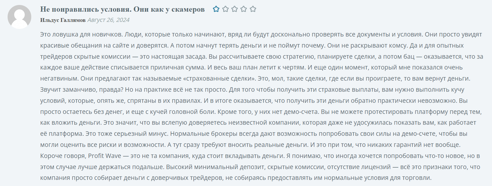 Есть отзывы о негативной работе службы техподдержки Profitwave и предположения о том, что терминал фейковый. Некоторые жалуются даже на блокировку аккаунтов после внесения средств.