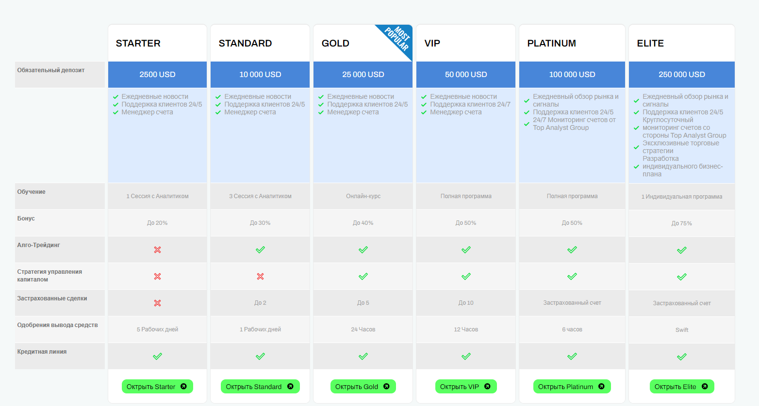 Размер бонуса в зависимости от выбор аккаунта может быть от 20 до 75 процентов. А алго-трейдинг доступен всем, кроме тех, кто выберет Starter. Также мы обратили, что на любом типе аккаунта есть обучение. Это может быть как 1 сессия с аналитиком, онлайн-курс, так и индивидуальная программа. На любом из типов счета за клиентом закрепляется менеджер и есть возможность получения ежедневных новостей.Сведения о гарантиях безопасности на платформе «ПрофитВаве»