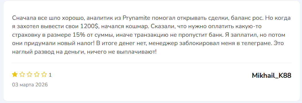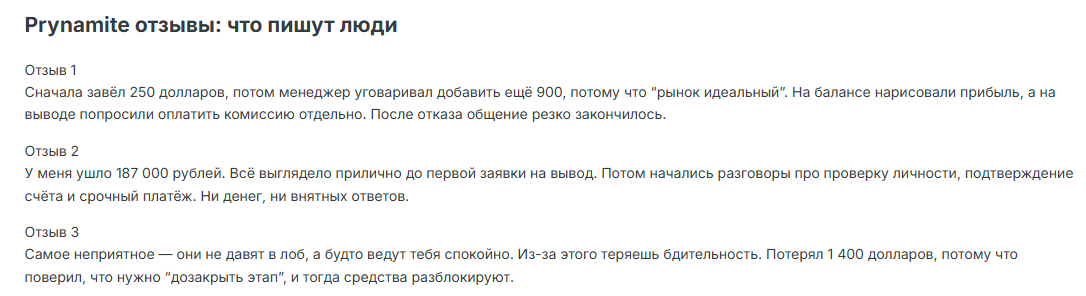 Все отзывы о проекте Prynamite зафиксированы в 2026 году, что еще раз подтверждает – новоиспеченный брокер пытается обманывать. Большинство пользователей переходят на ресурс через рекламу в сети. Менеджеры шарашки тщательно стараются усыпить бдительность потенциальных жертв обмана, а когда наступает момент выводить деньги – выясняется много дополнительных нюансов: налоги, комиссии и прочие выдуманные причины.