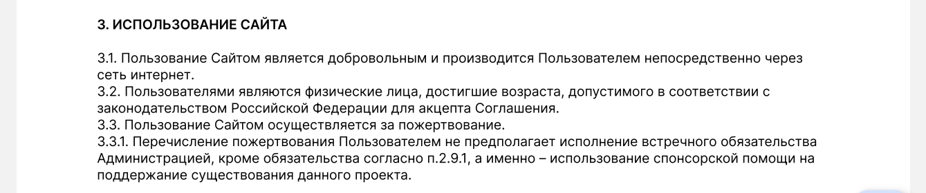 В Пользовательском соглашении написано, что администрация не оказывает никаких услуг, не отправляет товары, а все полученные средства принимает только в качестве пожертвования. Никаких встречных обязательств не предусмотрено.