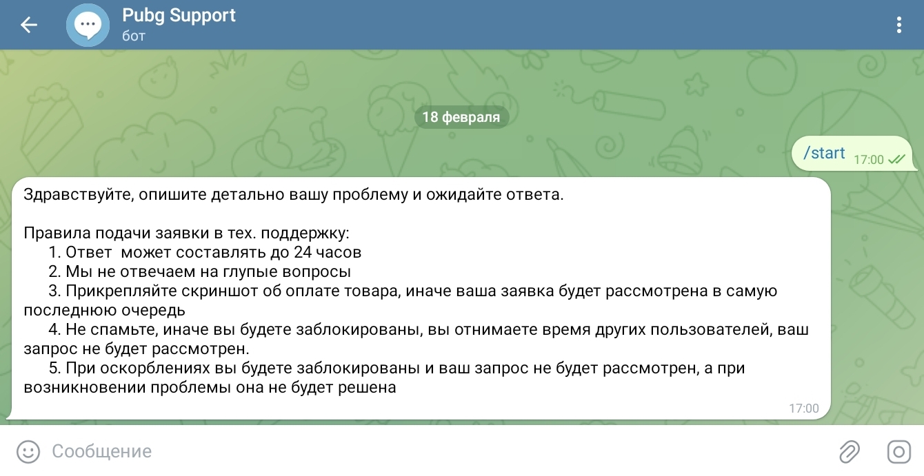 У проекта есть бот в Телеграмме pubgsupportshopbot, который служит только в качестве поддержки Pubg Up.