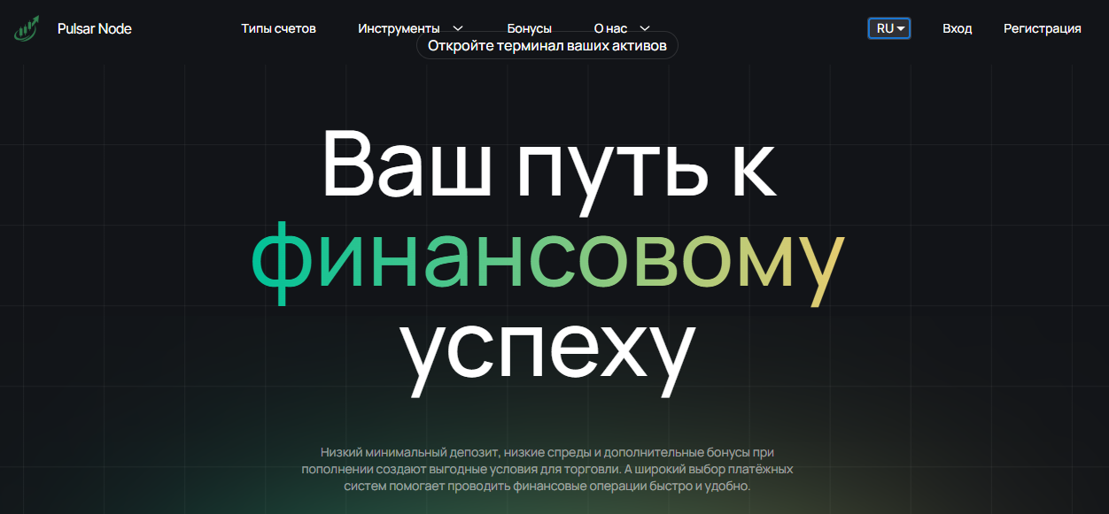В описании проекта Pulsar node com, который открывает “путь к финансовому успеху”, рассказывают про низкие минимальные депозиты, низкие спреды и дополнительные бонусы при пополнении.