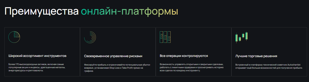 - для инвестиций предлагаются такие активы как нефть, газ, золото и другое сырье, акции и индексы, криптовалюта;