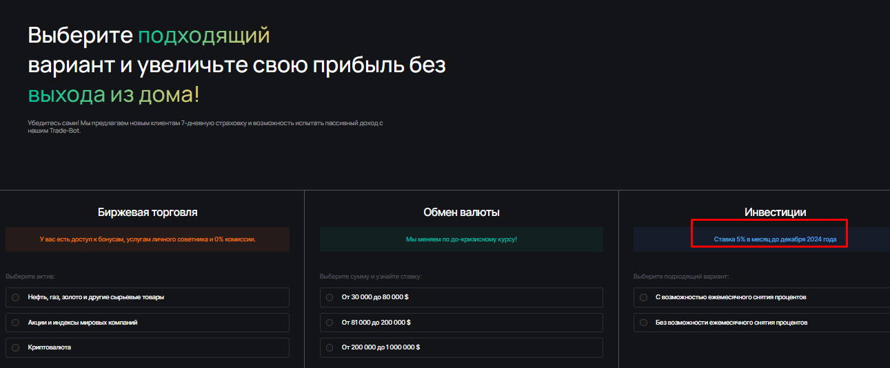 - услуги компании – биржевая торговля, обмен валюты “по докризисному курсу”, и инвестиции со ставкой 5%.