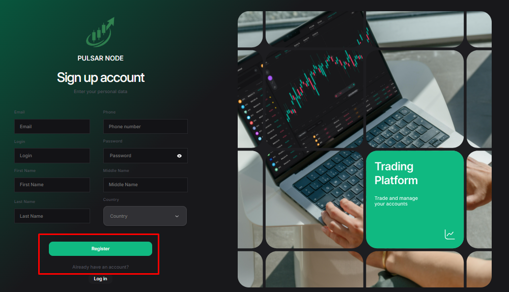 Зарегистрировать аккаунт можно на странице Trade pulsar node com. Заметим, что под формой нет текста Пользовательского соглашения. Его отсутствие грубо нарушает права будущих клиентов платформы.