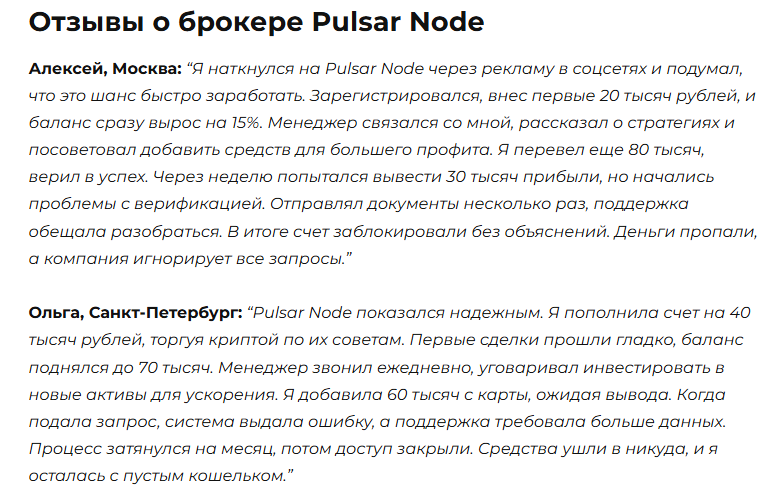 В негативных отзывах про Pulsar Node пользователи раскрывают схему воровства активов трейдеров. После внесения денег, баланс неизменно растет, а менеджер площадки советует “добавить средств для большего профита”. Агрессивная помощь аналитиков компании направлена на обогащение исключительно платформы и приумножение собственной комиссии от слива депозита.