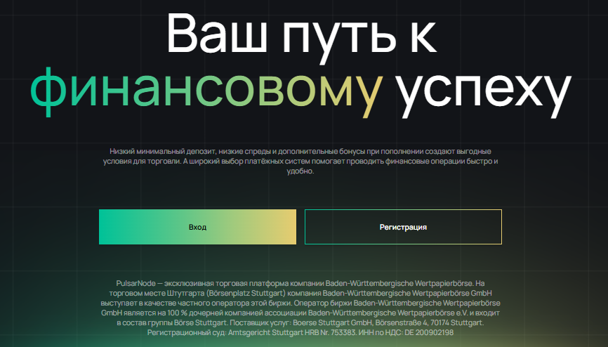 Pulsar Node биржа – инновационный крипто брокер, который “отвечает всем критериям качества”, как указывается на самой платформе. Анонимные руководители площадки утверждают, что оператором биржи является немецкая компания Baden-Württembergische Wertpapierbörse GmbH. Все детали о работе проекта расскажем в нашем обзоре.