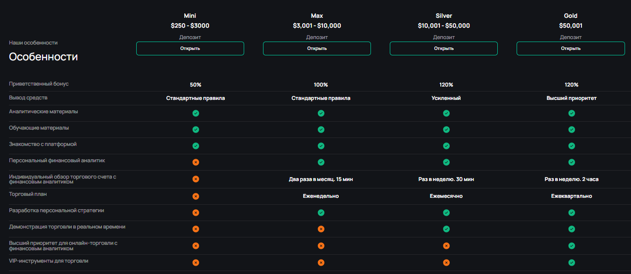 - тариф “Gold” предполагает минимальный вклад от 50 000 долларов и охватывает все доступные услуги.