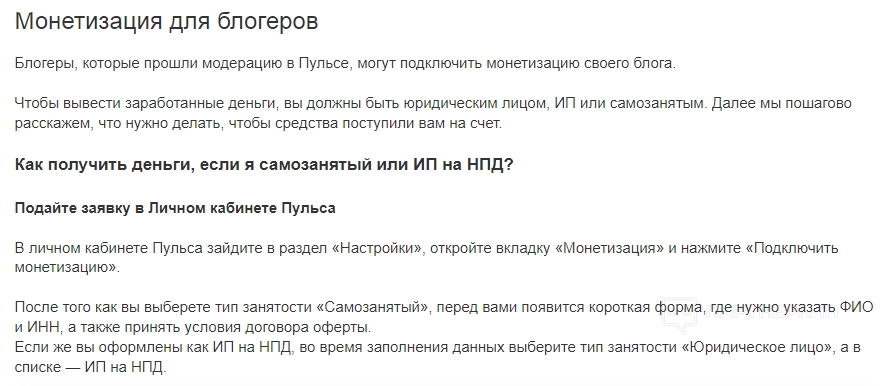 Для запуска монетизации на «Пульс» от «Мейл ру» необходимо опубликовать пять уникальных статей. Раньше было 10, правила смягчили. Блог отправится на модерацию, которая может длиться от двух до четырех недель. После одобрения останется подключить монетизацию в настройках личного кабинета. Предупреждаем, что для вывода потребуется статус самозанятого или ИП. Минимальная сумма для вывода – ₽5,000.
