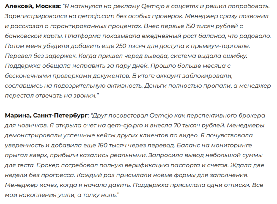 В интернете публикуется много отрицательных отзывов о Qemcjo. В них пользователи жалуются на брокера. Сначала клиентов убеждают внести крупный депозит. При выводе появляется ошибка. Поддержка ничем не помогает. В результате аккаунт все равно блокируется, а деньги вернуть не получается. Положительные отзывы мы не нашли.
