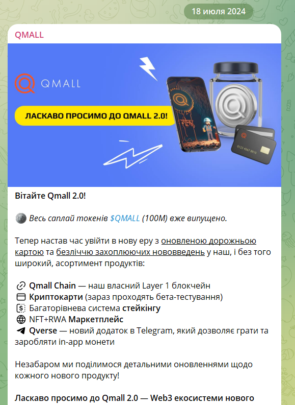 Последние новости о проекте QMX Official были в июле 2024 года, когда был анонсирован выход обновленной версии платформы плюс планы по выпуску карты для платежей криптой.