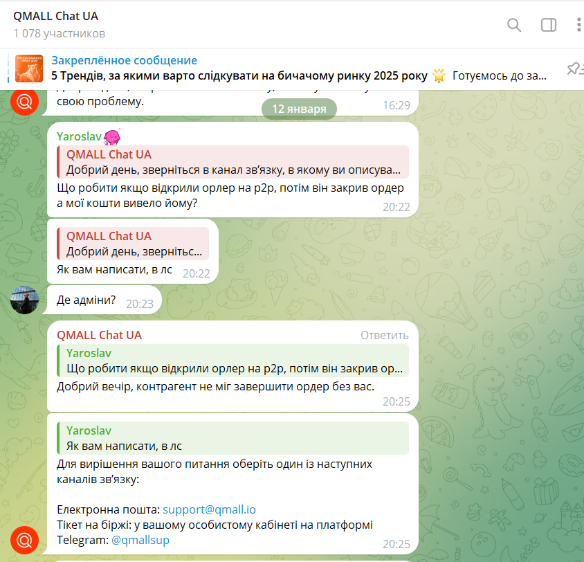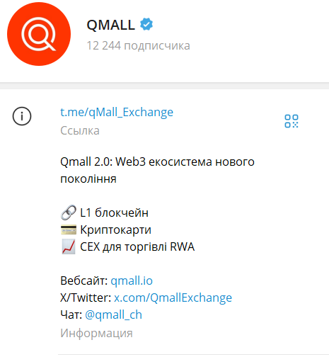 Основным каналом связи с клиентами биржи является паблик в Телеграмм QmallExchange. На него подписано более 12 тысяч пользователей по состоянию на январь 2025 года.
