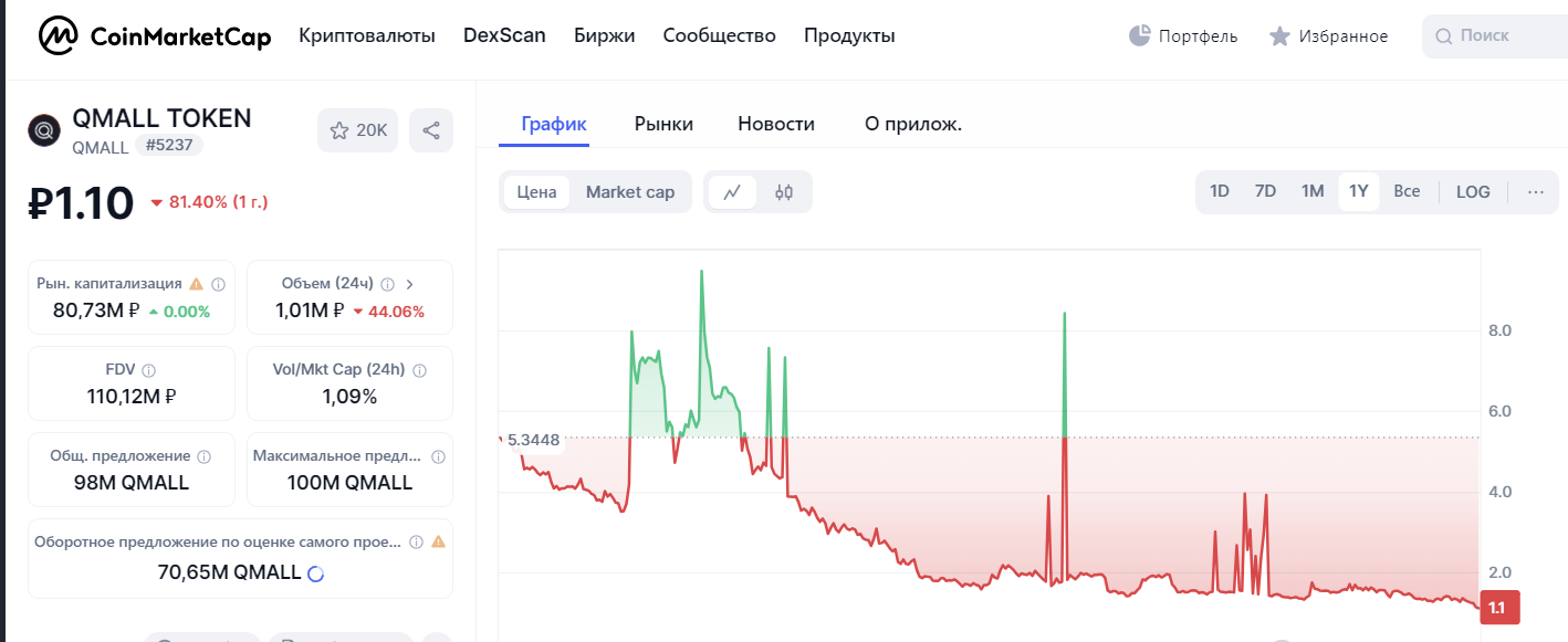 За 2024 год токен биржи Qmall подешевел более чем на 80%, что связано с блокировкой всех аккаунтов клиентов из России и Беларуси, которые составляли значительную часть клиентов. Такие мероприятия также насторожили других пользователей, опасающихся за свои средства.