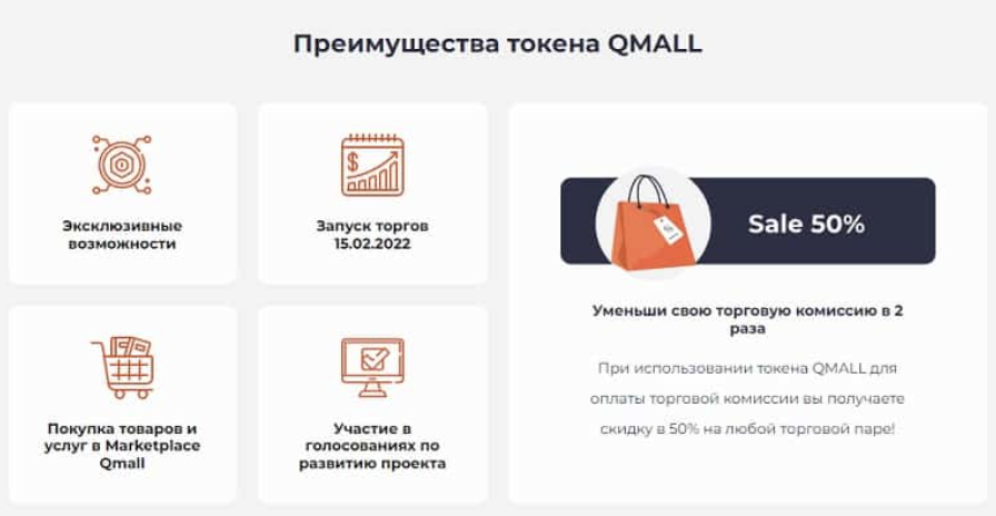 У биржи есть свой токен Qmall, который используется для сокращения расходов на комиссии биржи на 50%.