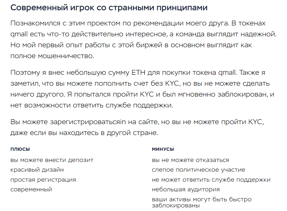 При выборе биржи Qmall стоит иметь в виду риск блокировки средств по различным причинам, что является основной претензией пользователей.