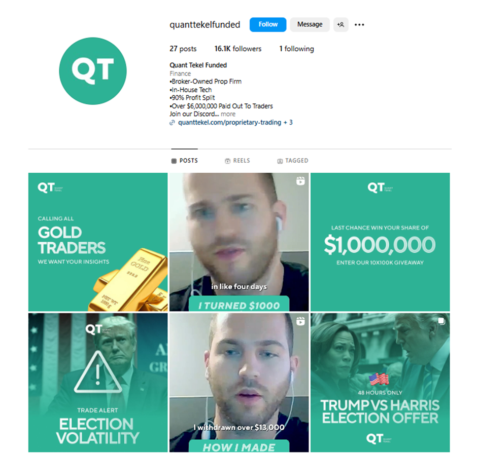 У брокера есть своя страница в Instagram. Она называется Quanttekelfunded. На ноябрь 2024 года, там более 16 тысяч подписчиков. Новые публикации появляются почти ежедневно.