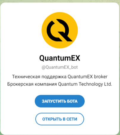 При появлении сложных задач, которые трейдер не может решить самостоятельно, можно обратиться в службу поддержки брокерского сайта. Техподдержка доступна пользователям только в Телеграм QuantumEX bot, номер телефона или электронная почта для связи отсутствуют.