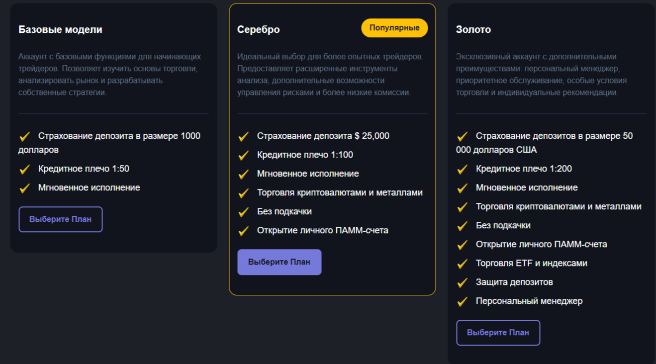 - Gold. Страховка депозита 50 000 долларов, leverage 1:200, торговля криптовалютами и металлами, обслуживание персональным менеджером, личный ПАММ-счет.