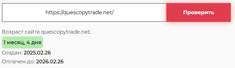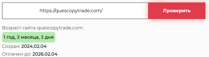 Брокер Quescopytrade Ltd не прошел проверку нашей редакции. Пользоваться сервисом рискованно, высока вероятность потери денег. Мы не рекомендуем инвестировать в платформу. Сомнения в ней вызваны рядом фактов: