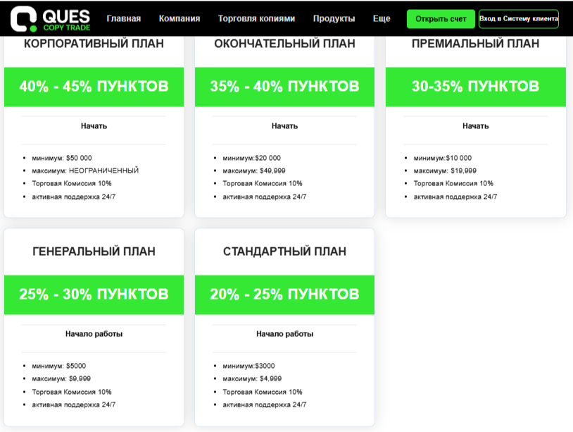 Клиентам платформы Quescopytrade доступно множество тарифных планов. Минимальная сумма инвестирования стартует с 1000$. Доходность вложений ― 20-80% в зависимости от выбранного тарифа.