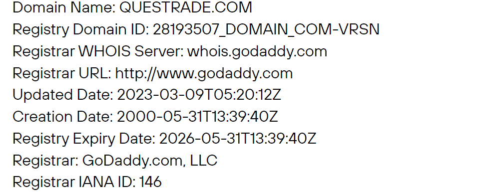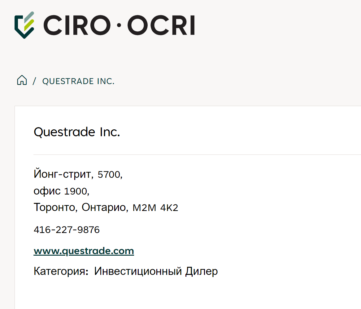 Фактический адрес QuesTrade com отслеживается через Ciro Ocri, или Канадскую организацию по регулированию инвестиций, членом которой значится брокер.