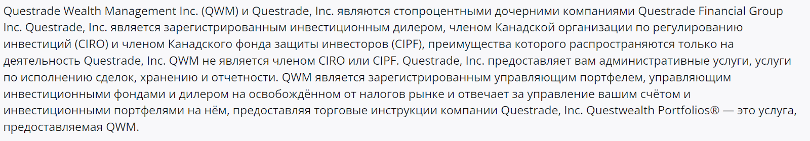 Это значит, что ответственность за риски лежит на основателе, а QuesTrade выполняет посреднические услуги.