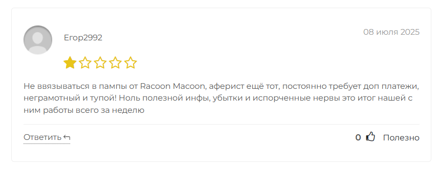 Информация о конкретных проектах, рекомендованных Racoon Macoon, не сохранилась, поэтому проверить их на обман, развод и мошенничество не представляется возможным. Вместе с тем нельзя исключать и того факта, что брокер зарабатывал на реферальных программах и публиковал рекламу скамных проектов.