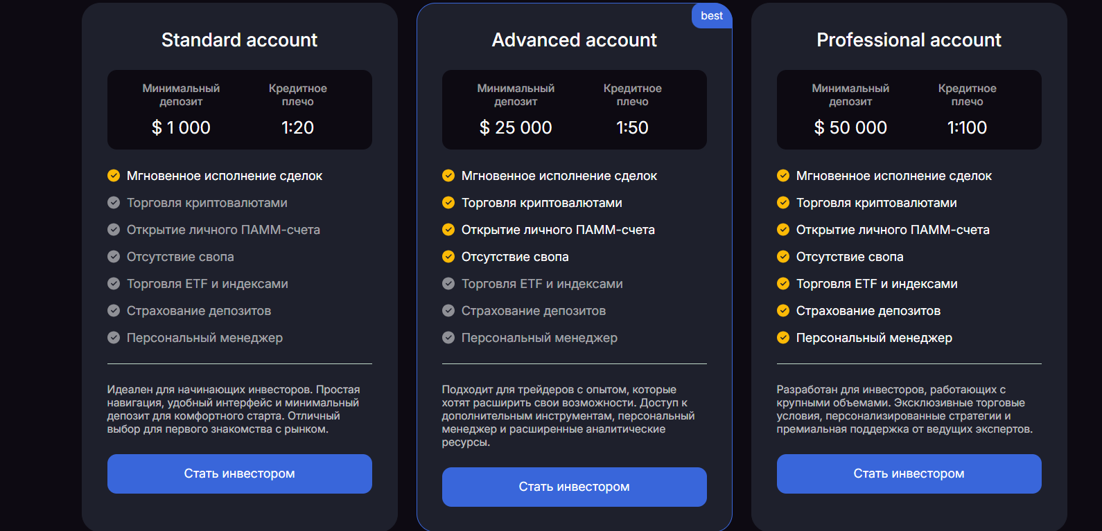 - “Advanced”. Можно начинать с депозитом от 25 тыс. долларов, торг. плечо 1 к 50, можно открывать ПАММ-счет. Также обещают отсутствие свопа;