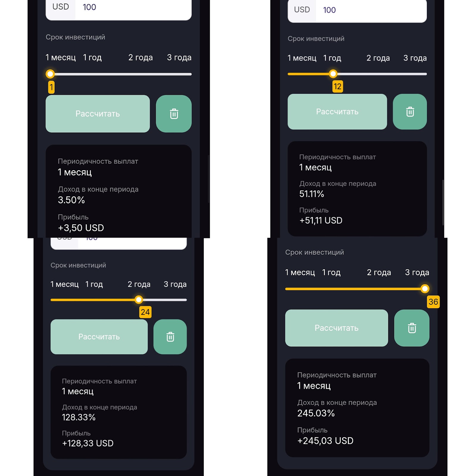 Инвесторы могут выбрать такие валюты инвестиционного кошелька: USD, EUR или же RUB. На платформе есть калькулятор с примерной прибылью. Пользователи могут вкладывать средства со сроком в 1 месяц, 1 год, 2 и 3 года: