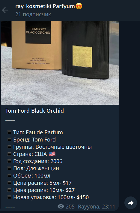 Так как отзывов о Ray Perfume в Телеграмм никто не пишет, о качестве товаров ничего сказать нельзя.