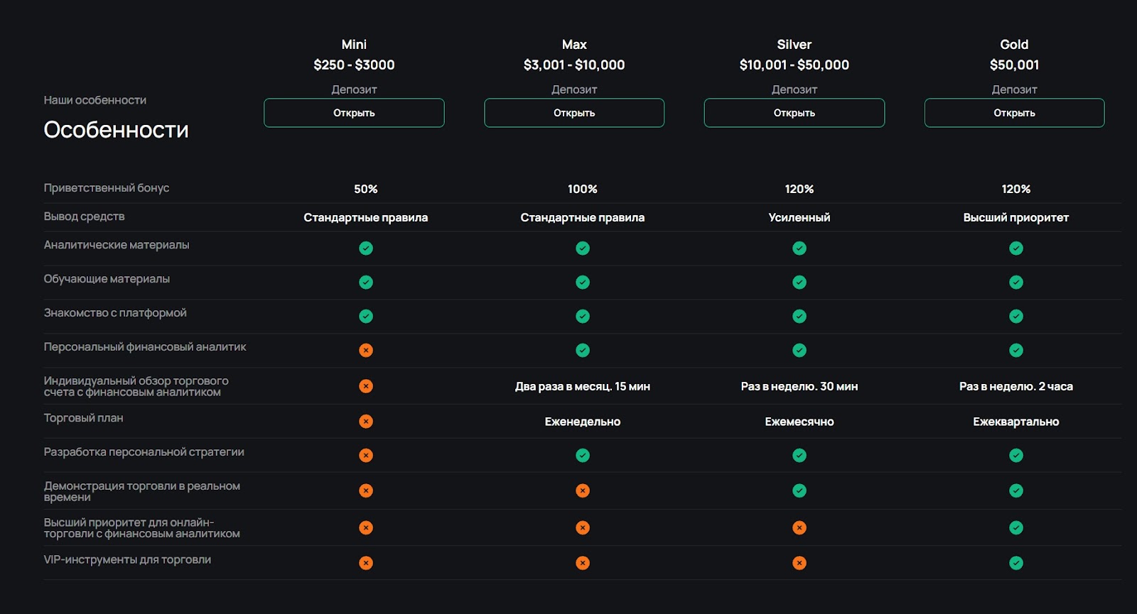 Чтобы работать на платформе, нужно внести минимальный депозит. Он зависит от тарифа и включенных в него функций. Цены стартуют от $250 и доходят до $50 000. В зависимости от выбора клиент получает набор преимуществ — приветственные бонусы в 50% или 100%, различные способы вывода денежных средств и аналитику.