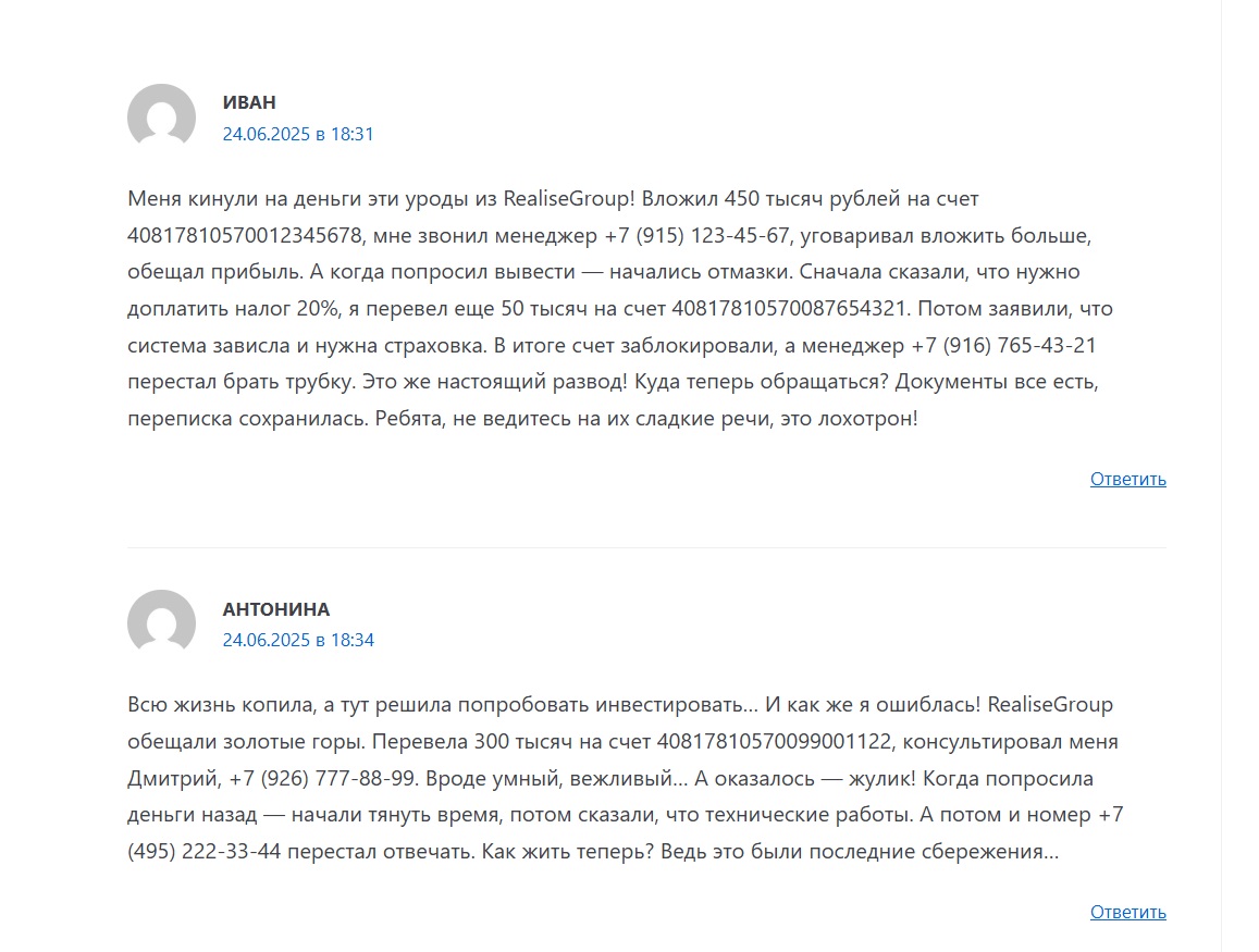 В своих отзывах о Realise Group клиенты жалуются на то, что их средства замораживают без предупреждения. Личный менеджер вымогает дополнительные деньги якобы для уплаты налога, при этом сумма может достигать 20% от заработка. После внесения средств техподдержка замолкает.