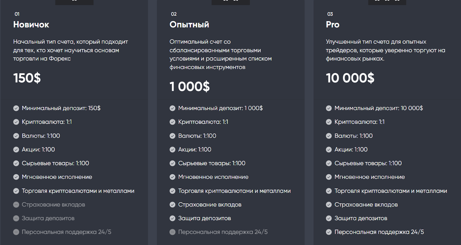 На площадке «Реал Трейд Пруф» доступно 3 тарифа: за 150, 1000 и 10 тысяч долларов. Отличаются они только дополнительными услугами вроде защиты депозита или страхования вкладов.