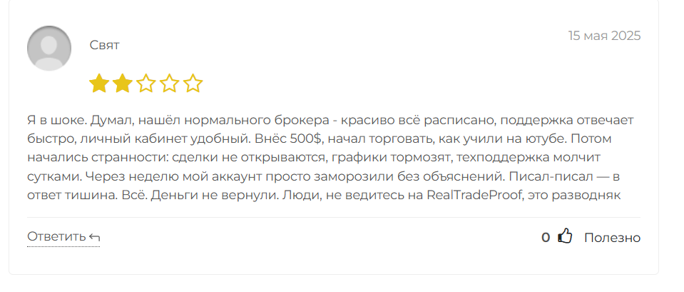 - Пользователи в отзывах о Real Trade Proof жалуются на блокировку аккаунтов при попытке вывести деньги;