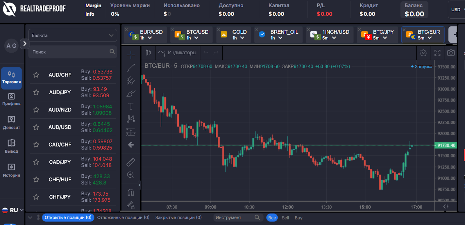 Создать аккаунт на проекте Real Trade Proof достаточно просто, так как почту и номер телефона верифицировать не требуется. Сразу после заполнения данных происходит переадресация на live realtradeproof com. Здесь появляется торговый терминал, в котором можно выбрать активы для торговли: валюты, акции, криптовалюты, сырье и индексы.