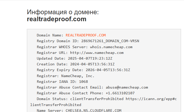 Связаться с поддержкой можно по телефону, email support @ realtradeproof com или онлайн-чат. В разделе «О нас» указано, что компания основана в 2015 году, а в 2017 вышла на международный уровень. Анализ доменного имени на whois ru показал, что его зарегистрировали в апреле 2024 года. Это не совпадает с заявлением владельцев, поэтому к их честности возникают вопросы.