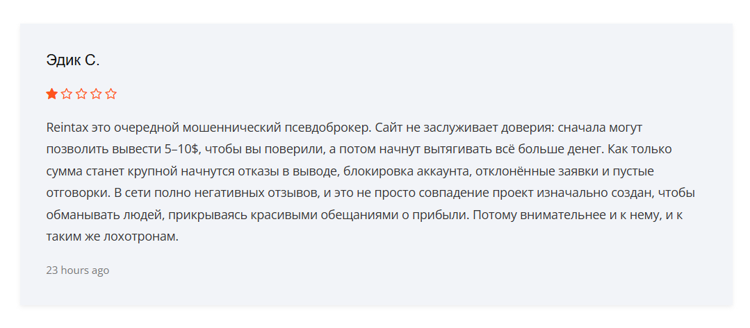 О брокере Reintax отзывы немногочисленны. Это легко объясняется, ведь площадка существует всего 17 дней. При этом нам уже удалось найти негативные комментарии о проекте. Пользователи пишут, что сайт принадлежит мошенникам. Они предлагают любые условия, лишь бы клиент внес деньги на депозит и начал торговать. В некоторых случаях даже дают вывести небольшие суммы в размере 5-10 долларов, чтобы усыпить бдительность жертвы. Но как только пользователь пожелает забрать сумму больше, его аккаунт просто блокируется. Вернуть деньги нельзя.
