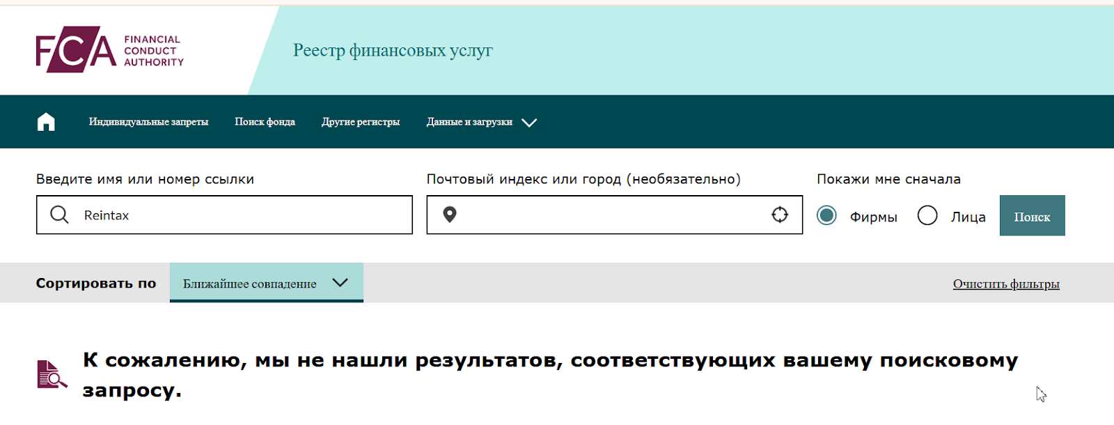 Из официальных сведений брокер указывает только наличие регистрации в Великобритании. Данная информация ничем не подтверждается. Про лицензии и документы ни одного намека. Мы проверили перечень юридических лиц FCA, в списке данного регулятора такой компании нет. Можно сделать вывод, что «Реинтакс» действует незаконно.