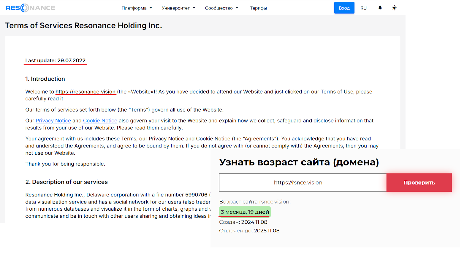 В разделе «Условия» указано, что последние изменения вносились в 2022 году. Значит, сайт проекта начал работу до этого времени. Однако проверка возраста сайта показывает, что, на февраль 2025 года, он работает всего три месяца. Более того, в самом тексте документа указано другое имя сайта. Это может быть признаком того, что платформа регулярно переезжает с сайта на сайт из-за постоянных блокировок.