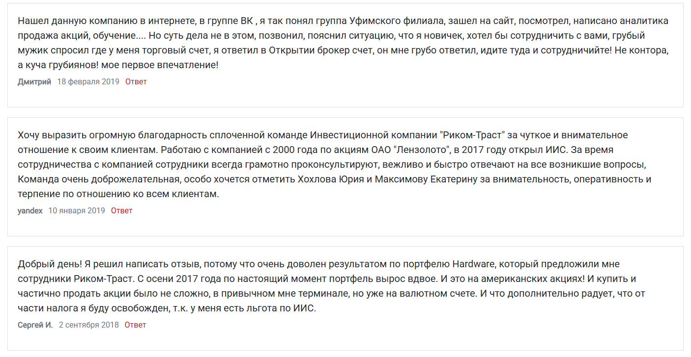 Многие пользователи отметили, что им понравилось обслуживание в компании РикомТраст. Они хвалят качество услуг и рекомендуют сотрудничество с проектом другим инвесторам.