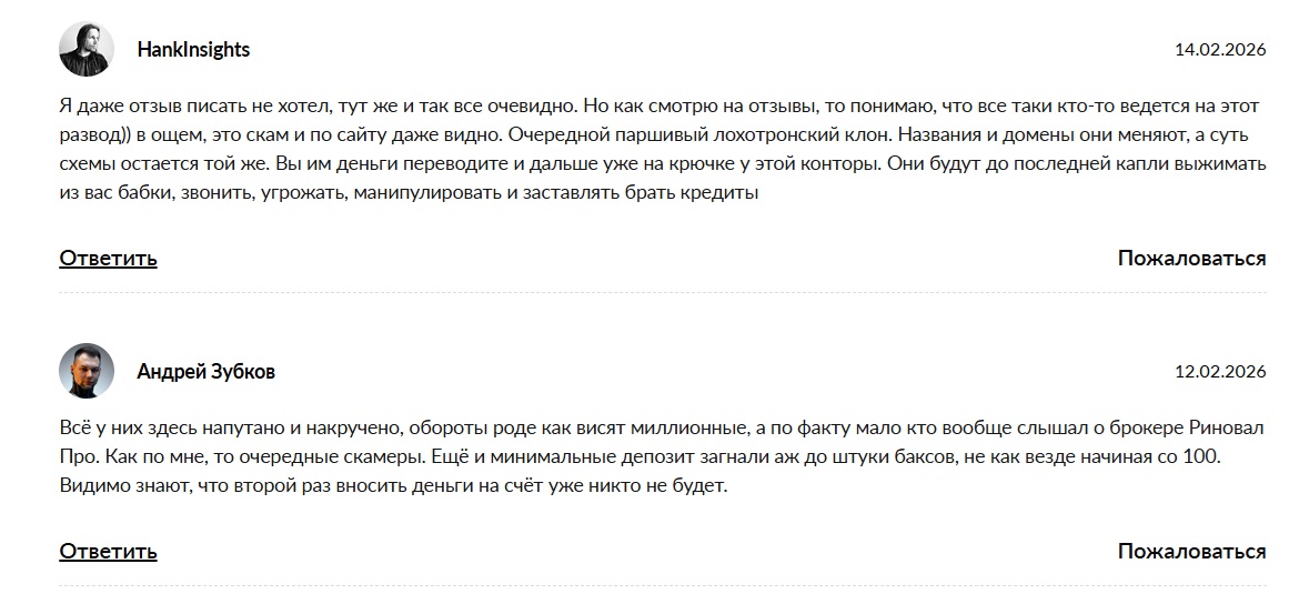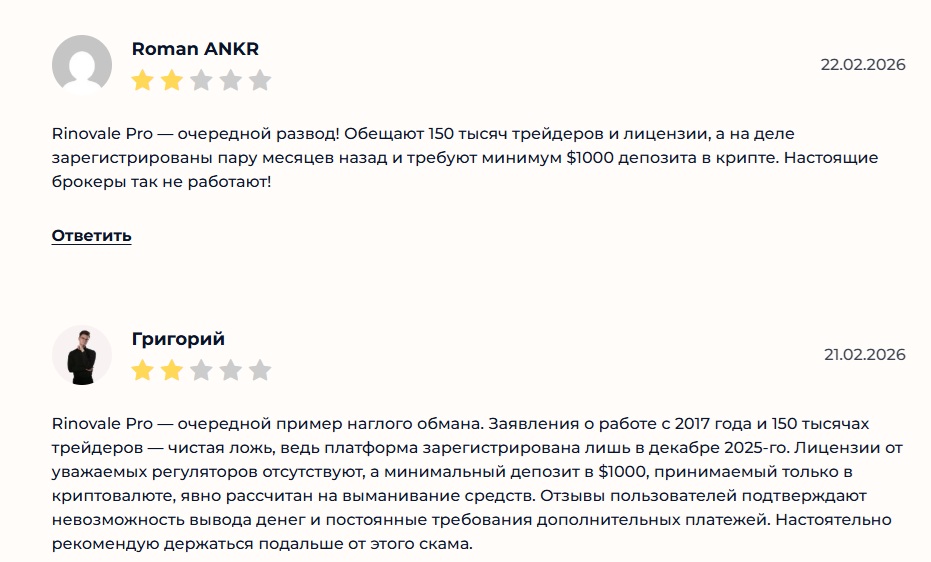 Отзывов о Rinovale pro в открытом доступе немного, но все они носят негативный характер. Пользователи предупреждают о явных признаках мошеннической схемы. Роман ANKR называет проект разводом. Он указывает на несоответствие заявлений реальности: брокер обещает 150 тысяч трейдеров и лицензии, хотя домен зарегистрирован всего пару месяцев назад. Минимальный депозит в 1000 долларов только в криптовалюте тоже вызывает подозрения.