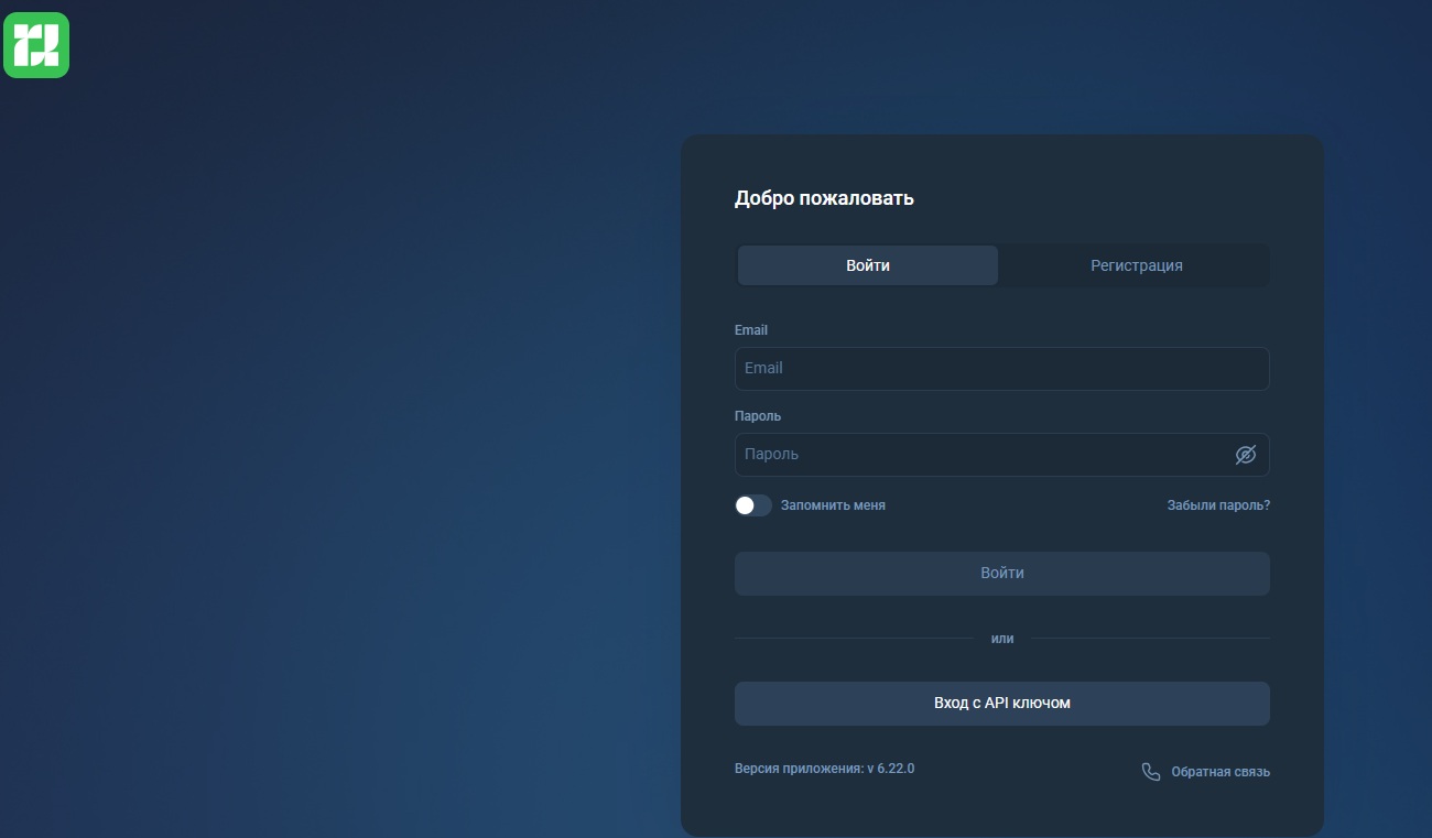 На сайте есть все стандартные разделы: информация о рынках, новости, терминал, FAQ и контакты. Доступны разные языки — английский и русский, значит, ориентируются на русскоязычную аудиторию. Зайти в личный кабинет можно двумя способами: по email и паролю или через API ключ.