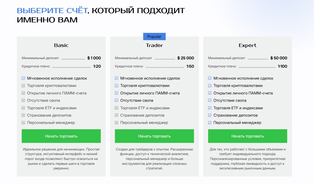 Набор опций во всех трех тарифах одинаковый. Это мгновенное исполнение сделок, торговля криптовалютой, открытие ПАММ-счета, отсутствие свопа, торговля ETF и индексами, страховка депозитов и персональный менеджер. Разница только в сумме депозита и размере плеча.